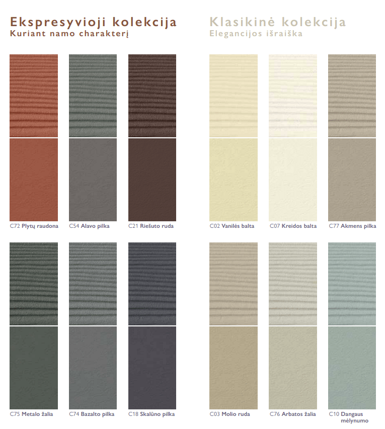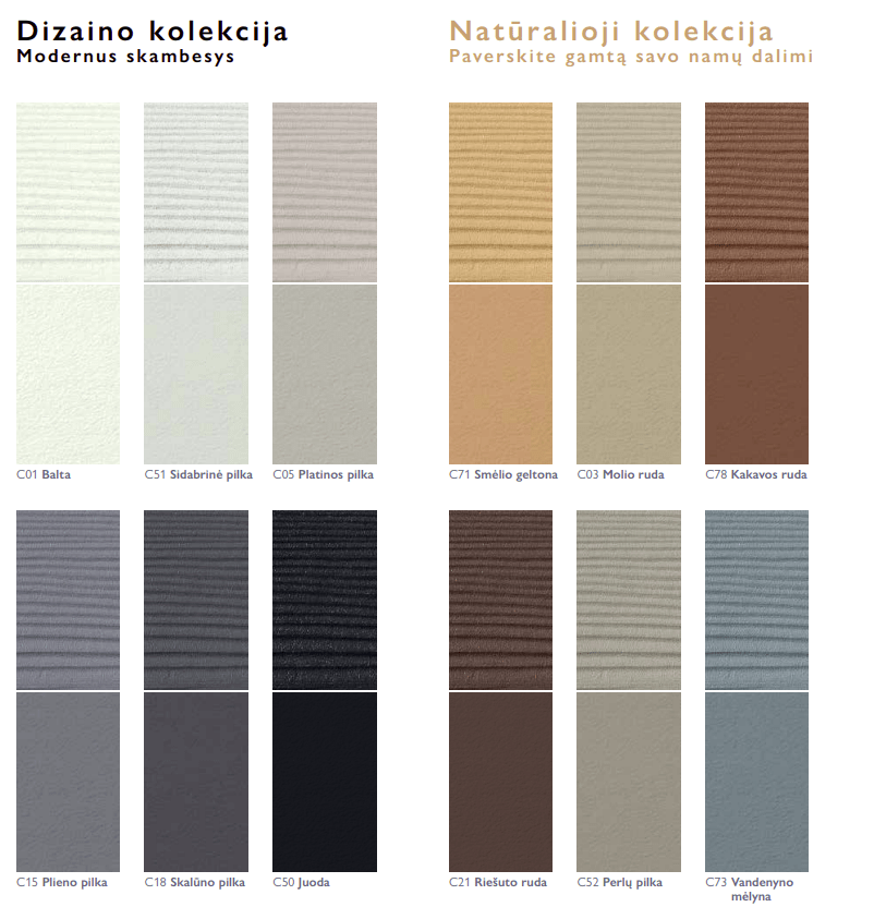 - Platus standartinių spalvų ir įvairių dažų sluoksnių pasirinkimas.