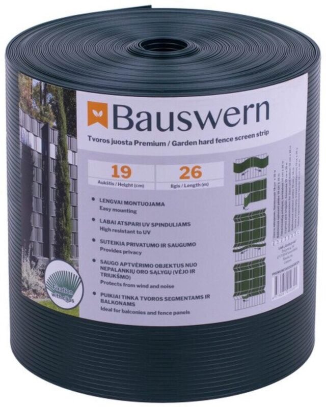 Tvoros juosta BAUSWERN PREMIUM, 26 x 0,19 m (700 g/m²) – puikus sprendimas norintiems privatumo. PP juostos tvorai apsaugo pramoninius bei privačius objektus nuo nepalankių oro sąlygų: stipraus vėjo ar sniego pūgos. Suteikia saugaus komforto jausmą bei apsaugo nuo pašalinių akių. Tvoros juostos yra gaminamos iš ilgaamžio ir UV poveikiui atsparaus PP, storis 700 g/m².